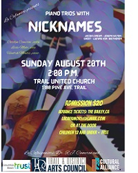 La Cafamore presents Piano Trios with Nicknames Sunday August 20th at 2 pm at The Trail United Church - 1300 PIne Ave, Trail Tickets $20....